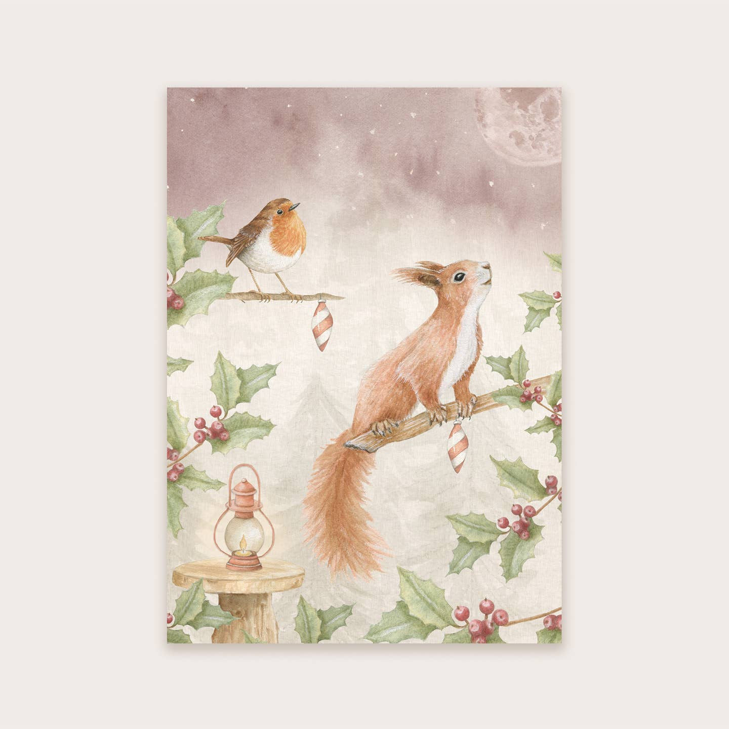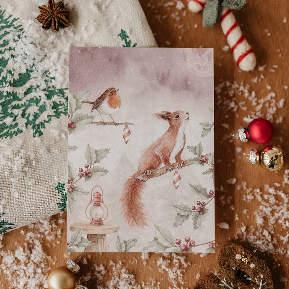 Breng een stukje natuur en warmte in het dagelijks leven met deze Ansichtkaart Eekhoorn & Roodborstje.