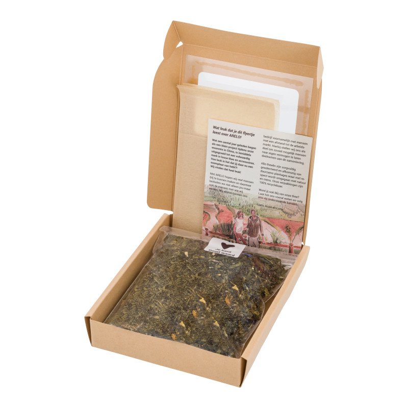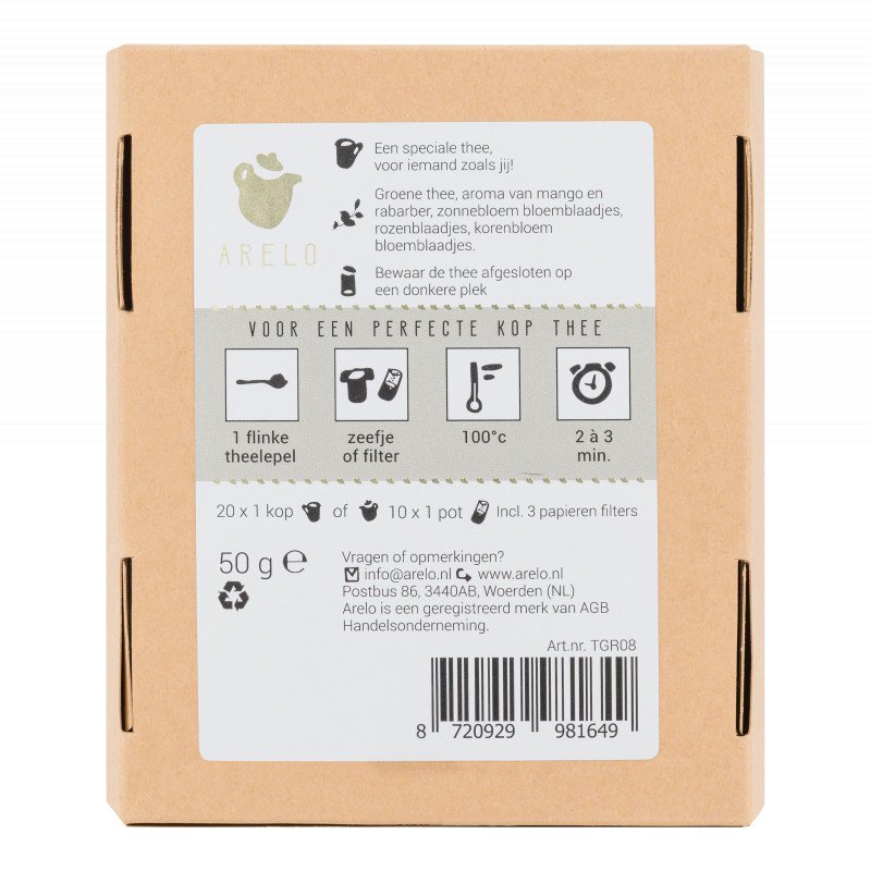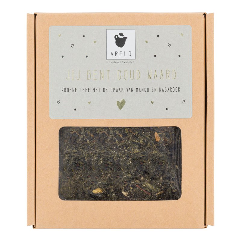 Je bent Goud waard! Dat is tenslotte iedereen toch? Met deze heerlijke groene thee met aroma's van mango en rabarber kan dat op een extra mooie en lekkere manier worden overgebracht. Het etiket bevat goud folie waardoor dit een extra speciaal cadeau is om te geven of te krijgen. Naast 50 gram losse thee van eerlijke afkomst bevat elk doosje thee 3 papieren filters zodat de thee meteen gezet kan worden. Alle thee van Arelo wordt verpakt en verzonden door mensen met een eigen plek op de arbeidsmarkt.