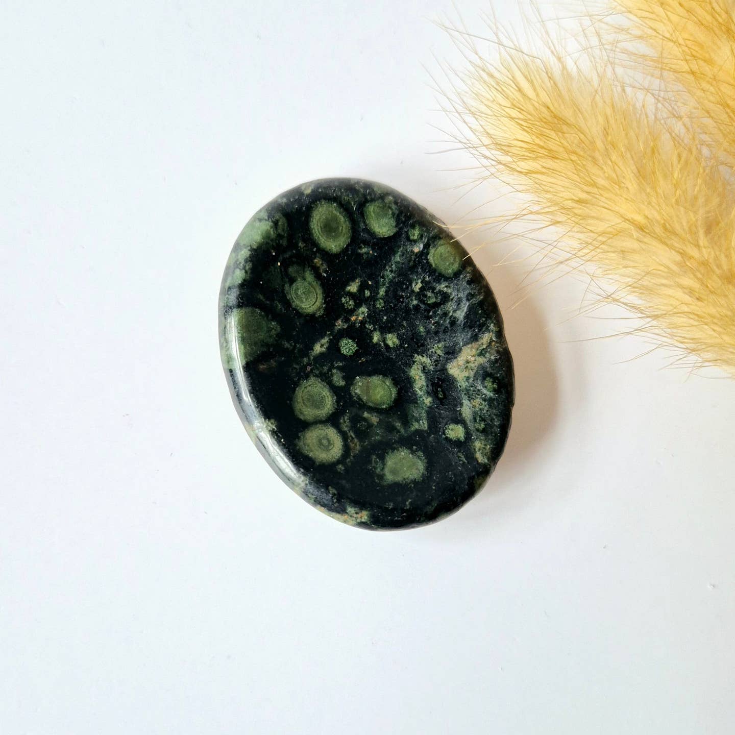 Stap in een diepe staat van rust met deze Kambaba Jaspis duimsteen, een mysterieuze, donkergroene steen met zwarte patronen. Kambaba (ook wel krokodillenjaspis genoemd) is een krachtige aardende steen die stabiliteit en veiligheid bevordert, en tegelijkertijd helpt bij meditatie en innerlijke heling.